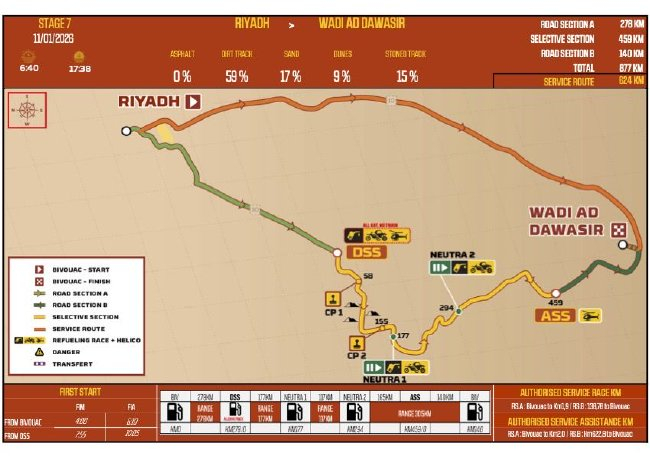 结束了休息日后,车手们今天将会再次迎来一个里程接近900km的赛段。从利雅得出发,一路南下来到代西尔谷小镇。特殊赛段长度458km,赛段多沙且整体节奏偏快,沿途两侧偶尔会有茂密的灌木丛绵延。