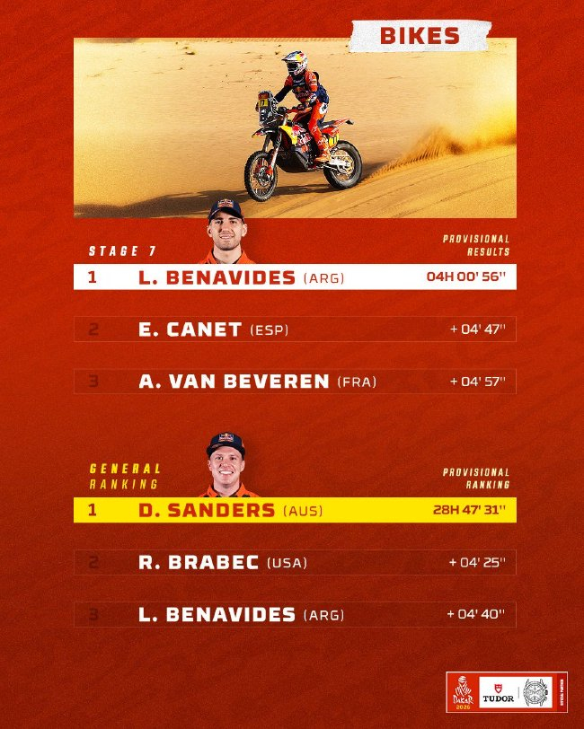 摩托车组总成绩榜前三名保持不变,丹尼尔·桑德斯(Daniel Sanders)稳居榜首,但今天获得的第三名将让他在明天的比赛中处于不利发车位置,因为他的主要追赶者里奇·布拉贝克(Ricky Brabec)明天将在第十位发车;这很有可能是本田车队在本赛段对战术有意而为之的做法。