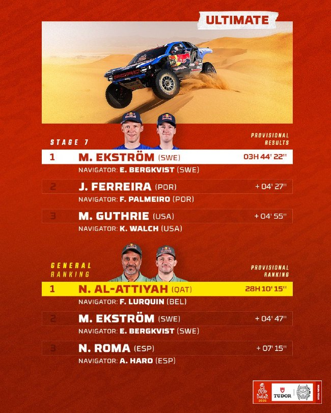 马蒂亚斯·埃克斯特罗姆(Mattias Ekström)今天最后一个计时段绝杀,赢下个人第七个达喀尔拉力赛赛段冠军。前DTM总冠军现在重新回到总成绩榜第二位,仅落后阿尔-阿提亚(Nasser Al Attiyah)4分47秒。